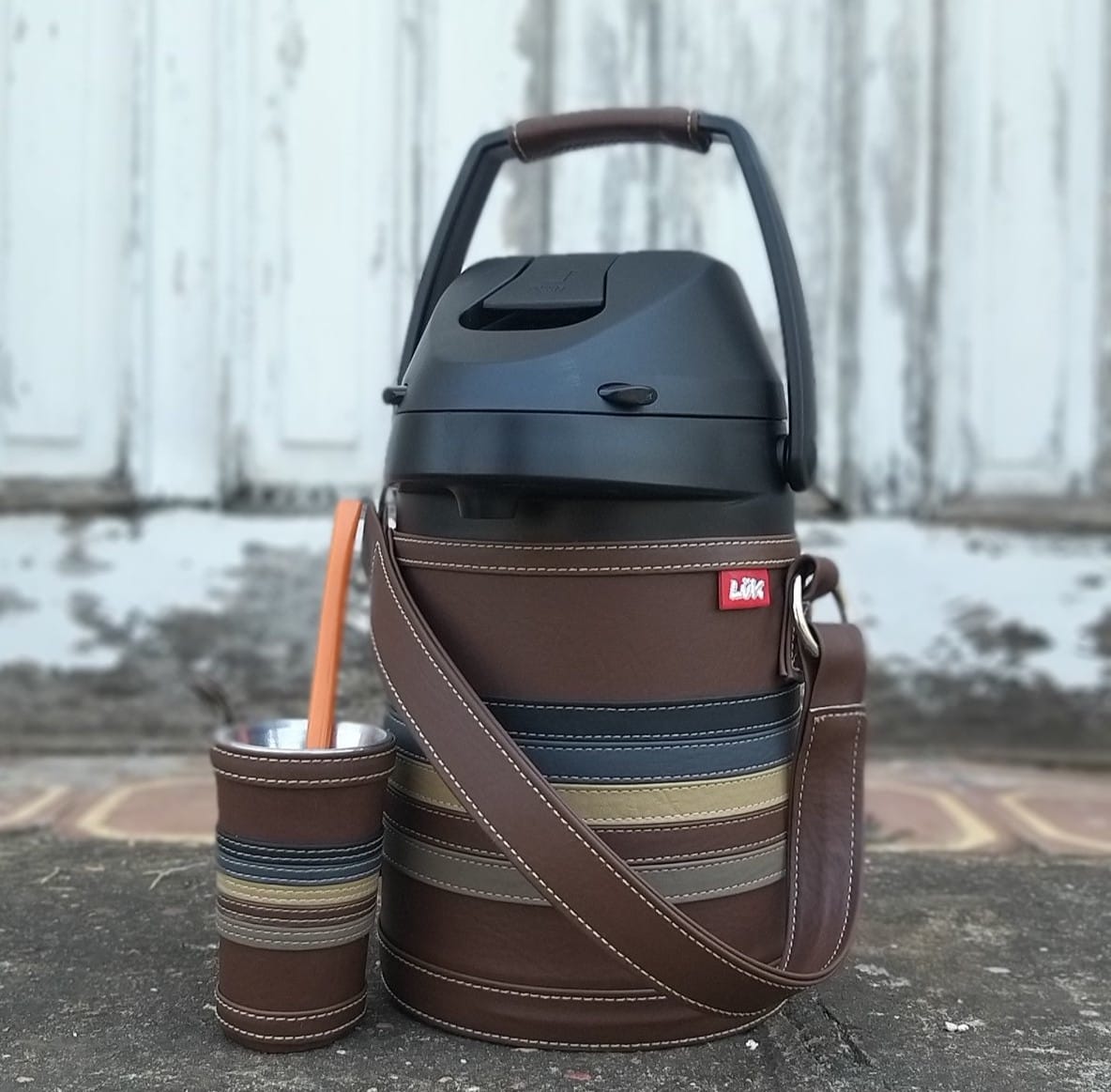 Termo de Acero Inoxidable de 2.5 Litros de capacidad para agua fría / caliente. Termo forrado artesanalmente en cuero símil de alta calidad de color Marron chocolate con detalles en lineas de colores en el centro . El termo va acompañado de una guampa. No incluye la bombilla. Solicitar presupuesto para envíos nacionales e internacionales.
