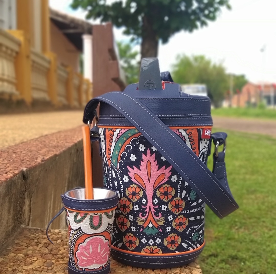Termo para Agua fría de 2.5 litros, de la marca Termolar. Forrado artesanalmente en cuero símil color azul marino, con estampado floral tela impermeable y detalles en color naranja. Incluye guampa. No incluye la bombilla. Solicitar presupuesto para envíos nacionales.