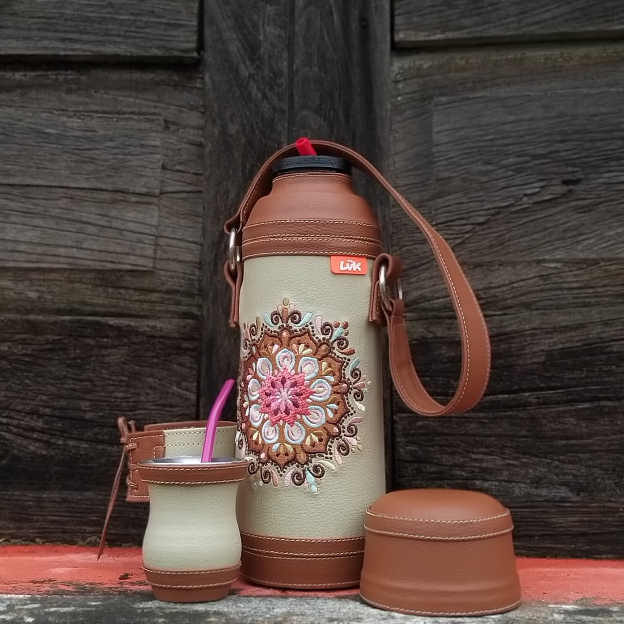 Termo para agua caliente de la Marca Termolar Mundial capacidad de 1 Litro, forrado artesanalmente en cuero símil de color beige con detalles en Marrón y bordado motivo Mandala en el centro. Otras opciones de colores: Rojo, verde esmeralda y fucsia. No incluye la bombilla. Solicitar presupuesto para envíos nacionales así como internacionales.