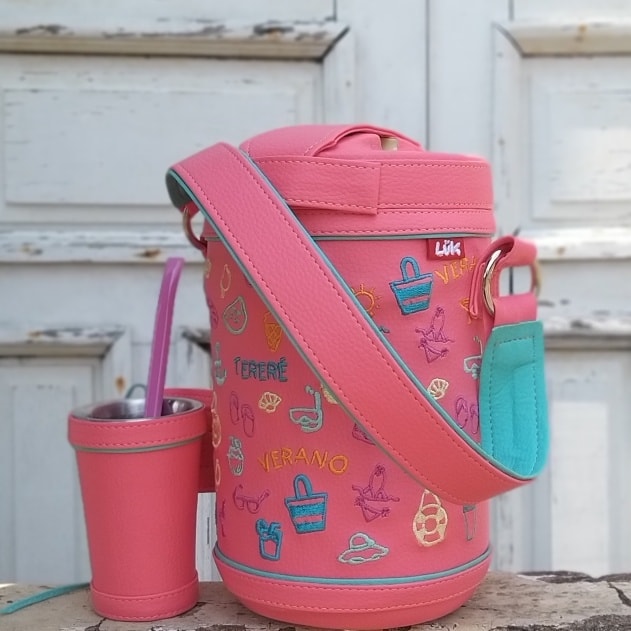 Termo forrado para tereré de 2.5 litros, de la marca Sirena. El termo forrado artesanalmente en cuero símil color rosa con detalles en verde agua y bordado . Opciones disponibles en otros colores. No incluye la bombilla. Envio gratis a todo el país.