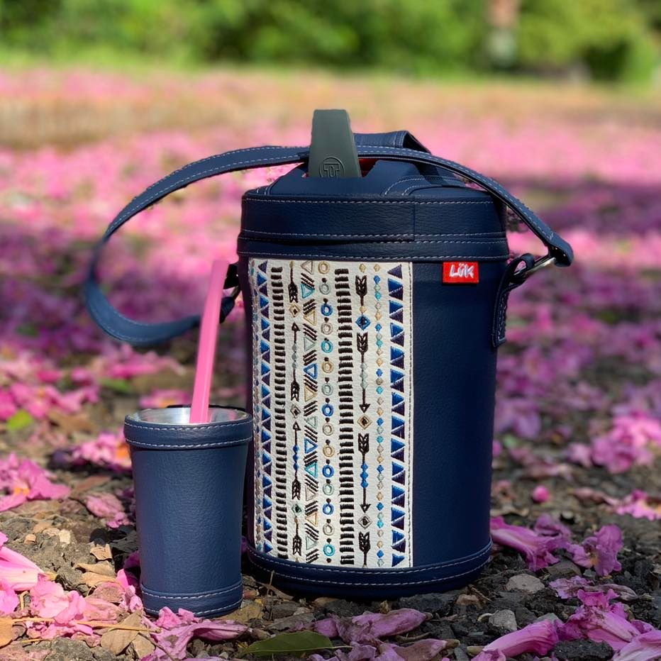 Termo para Agua fría de 2.5 litros, de la marca Termolar. Termo forrado artesanalmente en cuero símil color Azul marino, con un corte de color blanco en el centro con bordado diseño  étnico. El Nuevo Fliptop es un producto con aislamiento térmico en PU, que garantiza alta resistencia, durabilidad y conservación térmica diferenciada. Mantiene tus bebidas frías mucho más tiempo. Incluye guampa. No incluye la bombilla. Solicitar presupuesto  para envíos nacionales e Internacionales.